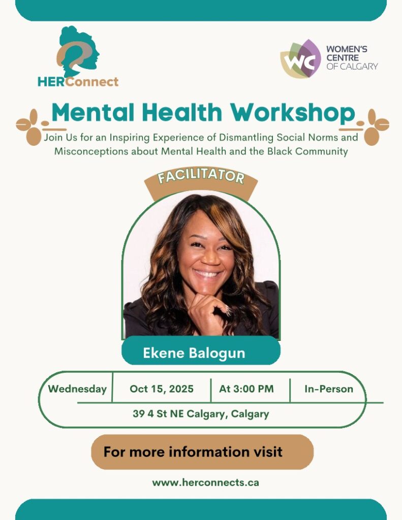 Join HERConnect for a safe, confidential and community-centered workshop led by Ekene Balogun. This session explores how social norms and misconceptions affect mental health in Black communities and offers practical tools to support emotional wellbeing.
